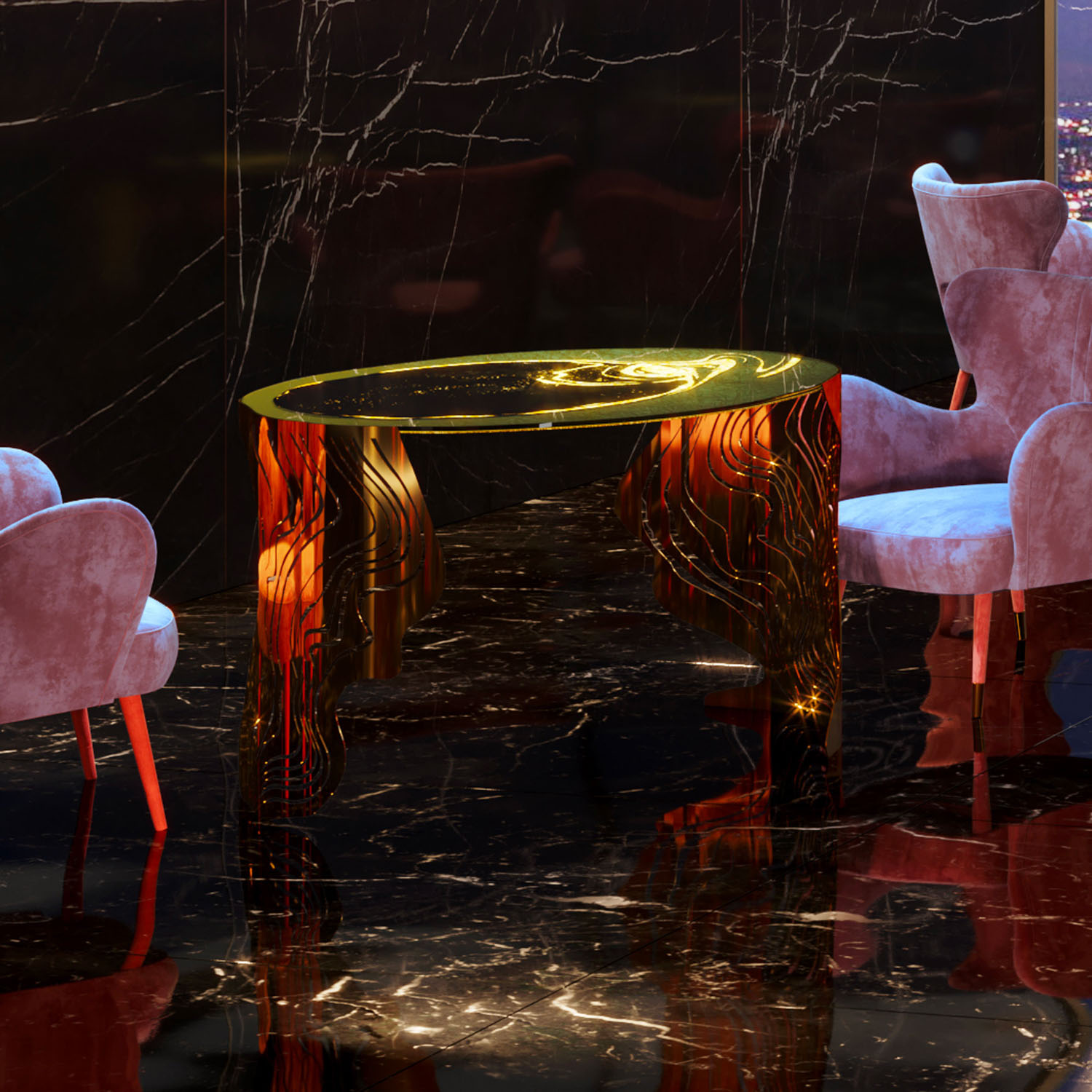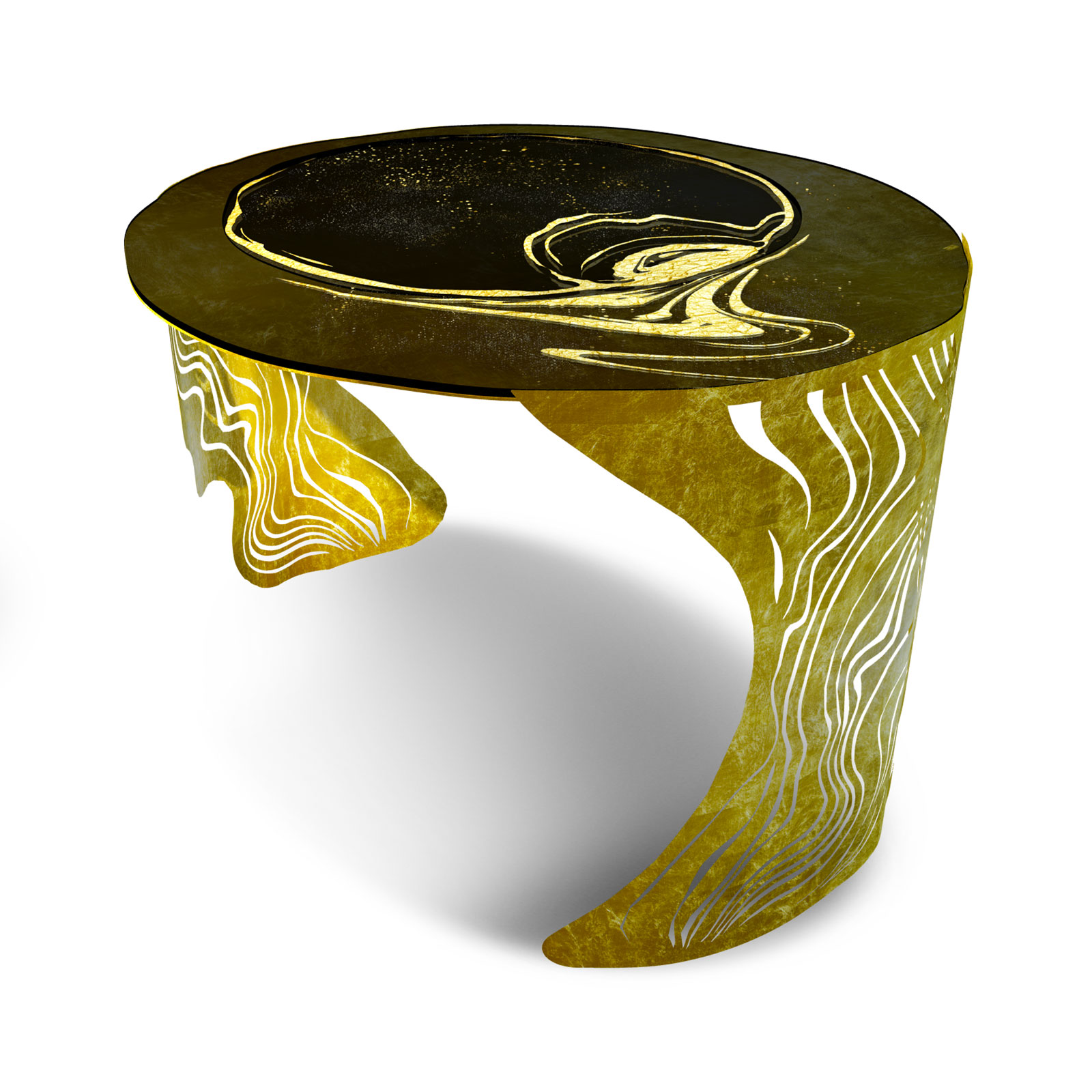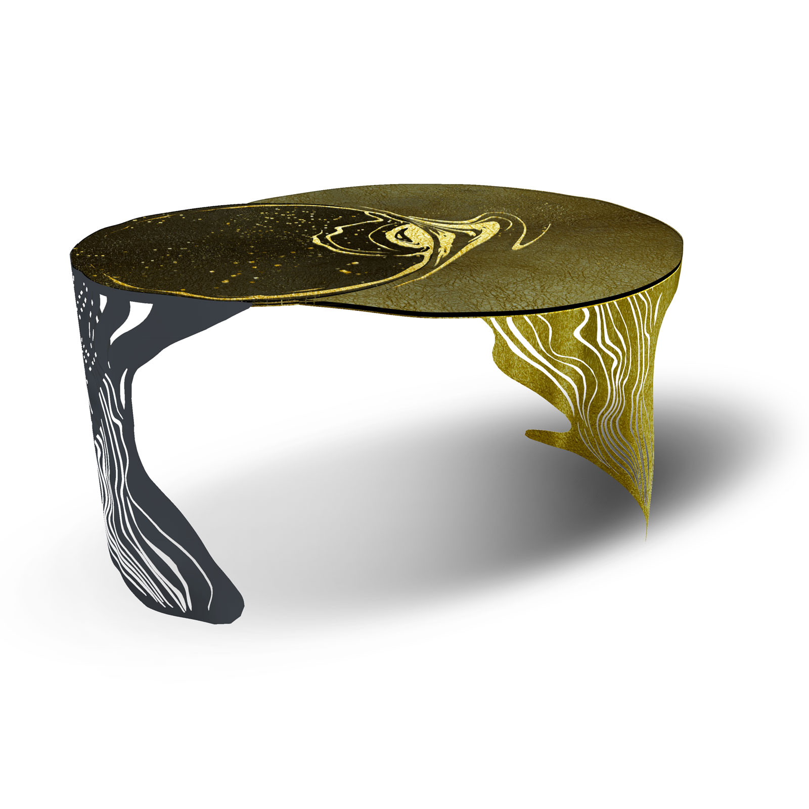 Table with smoked extra-clear tempered shaped glass top, 10 mm. thickness, decorated with sandblasting for handmade stars, Trilli Effect (golden powder), gold coloured leaf inserts. Metal base, 30 mm. thickness, decorated with laser cuts and covered with gold coloured leaf (and matt black painting for Umbra) finishing.