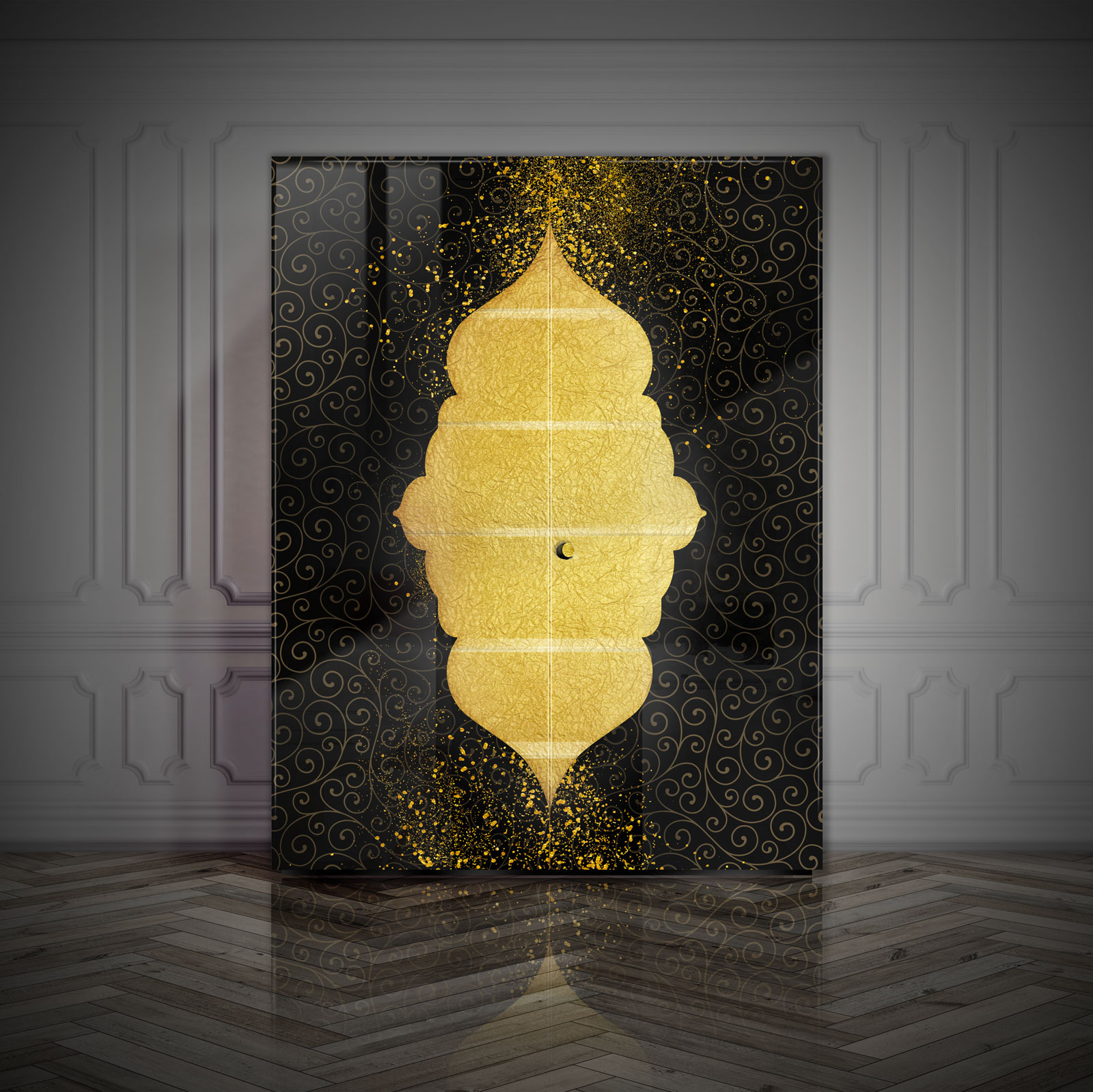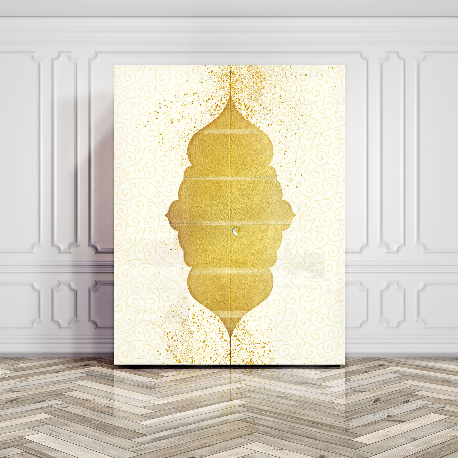 Sideboard with extra-clear tempered shaped glass doors, thickness 6 mm., decorated with sandblasting for handmade stars, gold coloured leaf inserts, Trilli Effect (golden powder), golden bronze and white/black painting. Tapered wooden structure with 2 extra-clear tempered glass shelves. Gold coloured leaf finishing inside and glossy white/black lacquering outside.Adjustable interior lighting.