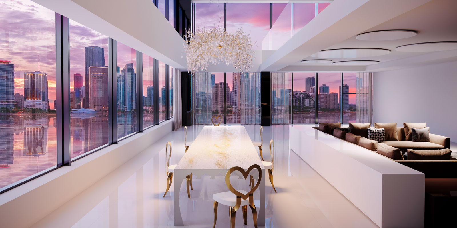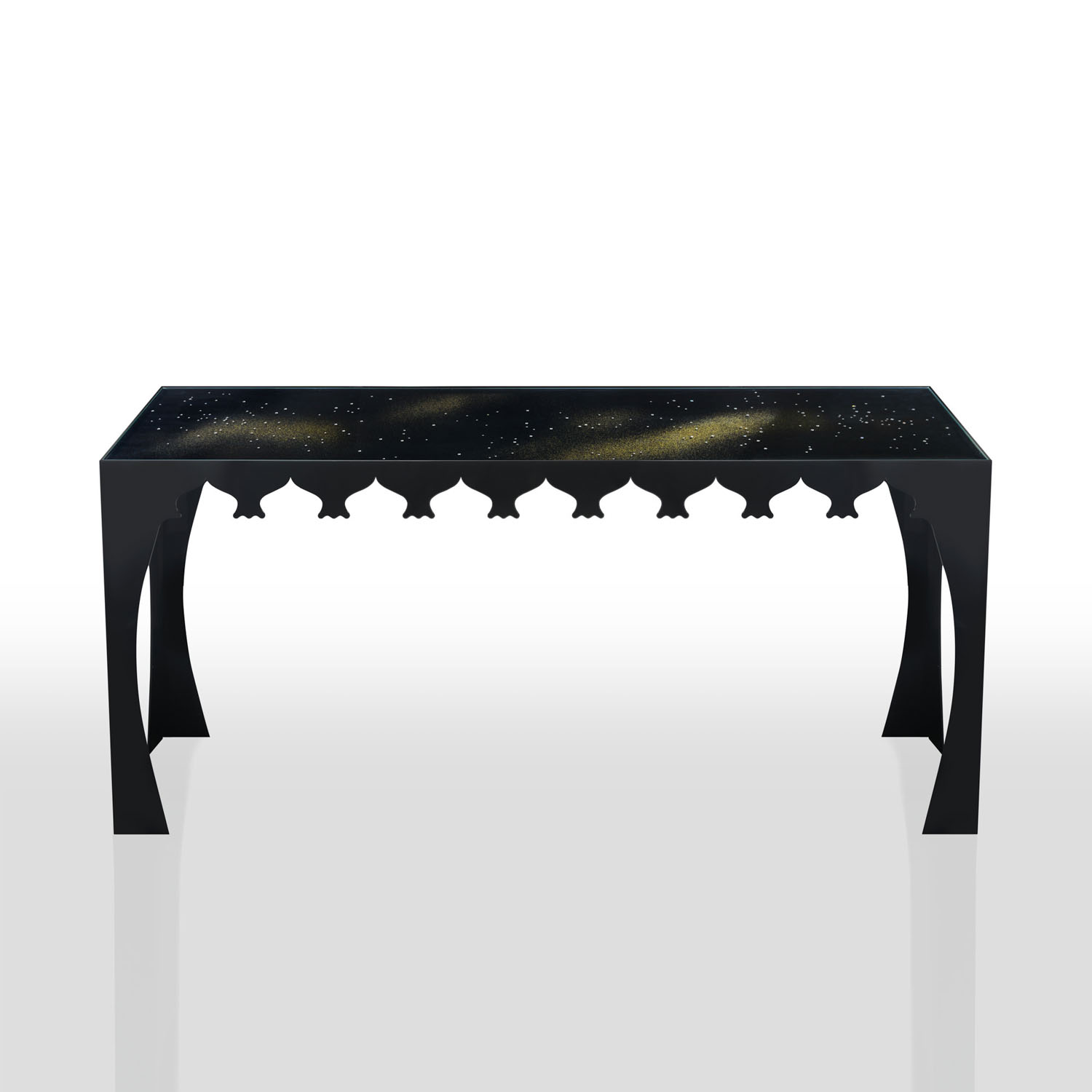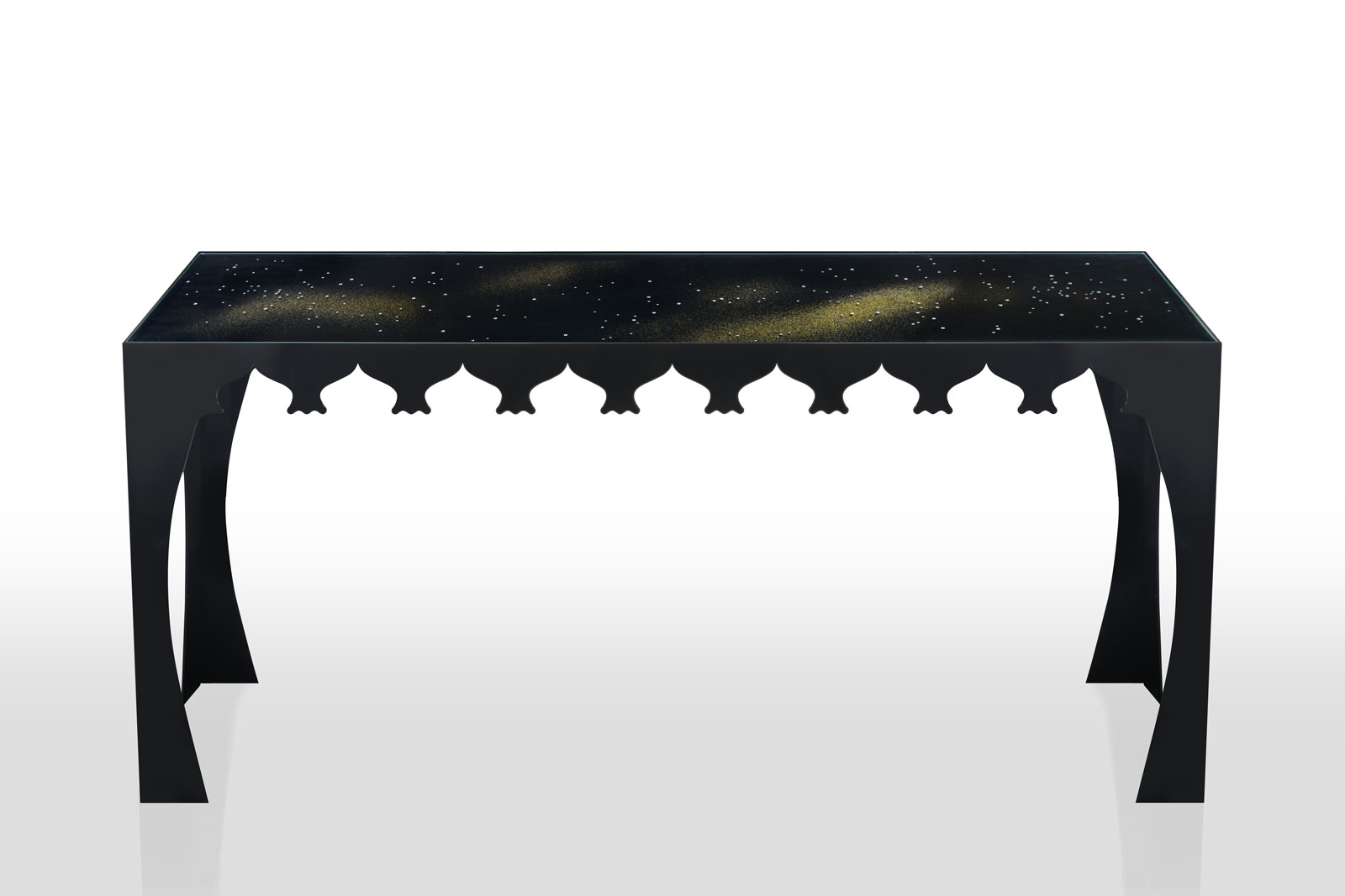 Console (Viaggio I) with glass top composed of 2 extra-clear tempered glass sheets with Swarovski® application between them, Trilli Effect (golden powder) and white / black painting on the bottom one. Thickness 18 mm.