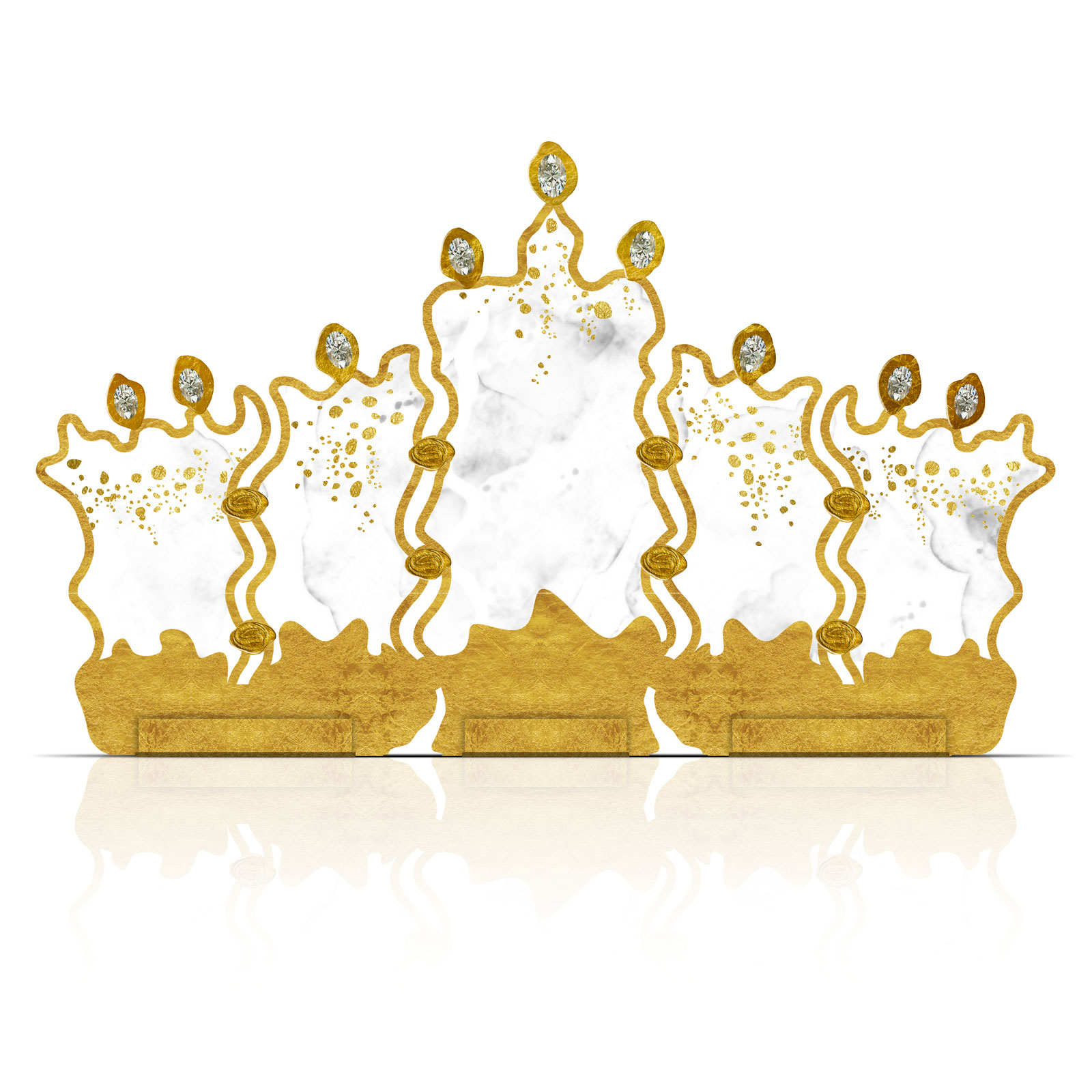 Headboard composed by five extra-clear, tempered shaped glass sheets, thickness 10 mm. each, with sandblasting, gold coloured leaf and digital printing. Metal frame covered with gold coloured leaf. Upper plates welded to the frame with application of crystals on the top.