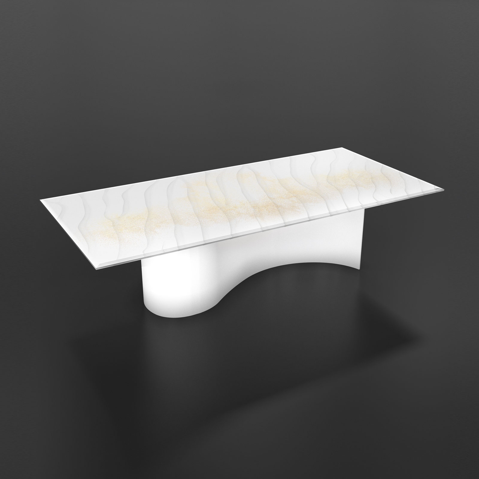 Tables with extra-clear glass top, tempered or layered based on the chosen decoration, bevelled, 10 mm thickness (5+5), transparent and decorated with the following processing: sandblasting, Trilli Effect (golden powder), gold coloured leaf (or gold leaf effect), painting and digital printing. Structure in 3 mm thick steel, with laser cut and calendering. The base of the top decoration can have various finishes: gold coloured leaf, brushed steel, brushed brass and gold, white or matt black paint.