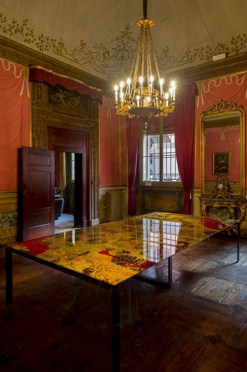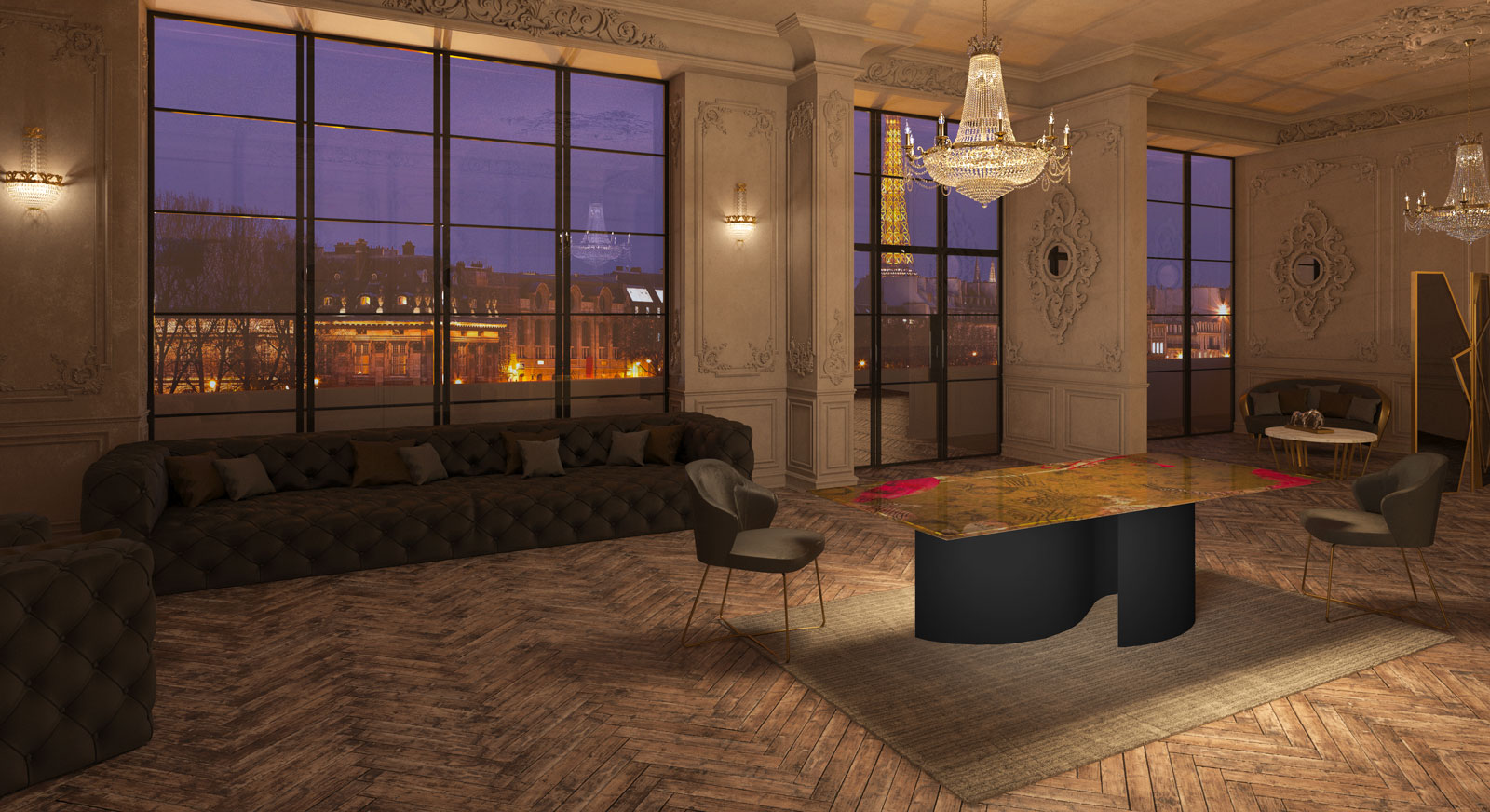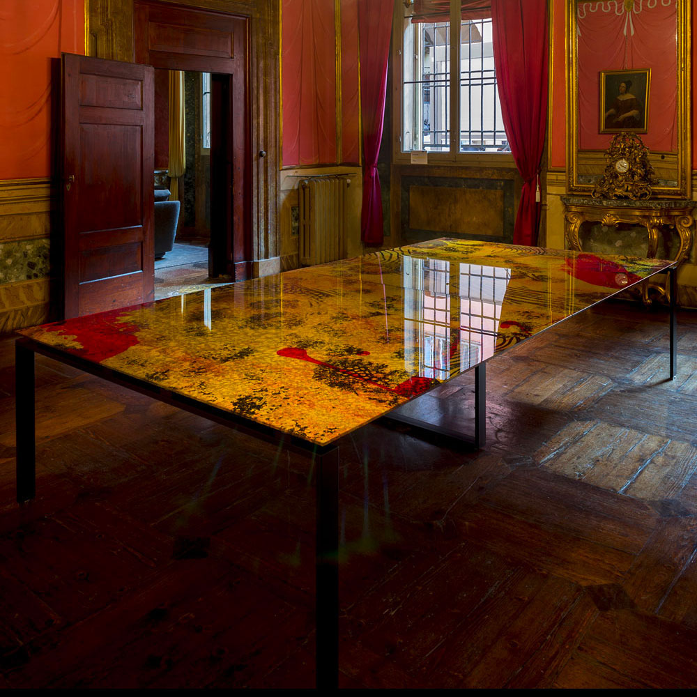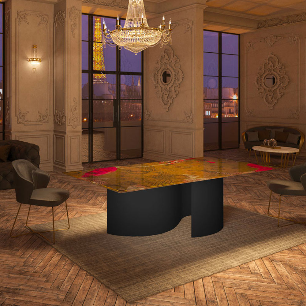 Tables with extra-clear glass top, tempered or layered based on the chosen decoration, bevelled, 10 mm thickness (5+5), transparent and decorated with the following processing: sandblasting, Trilli Effect (golden powder), gold coloured leaf (or gold leaf effect), painting and digital printing. Structure in 3 mm thick steel, with laser cut and calendering. The base of the top decoration can have various finishes: gold coloured leaf, brushed steel, brushed brass and gold, white or matt black paint.