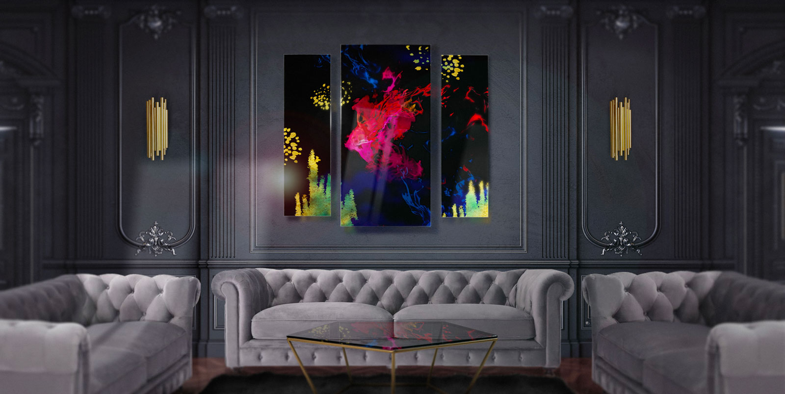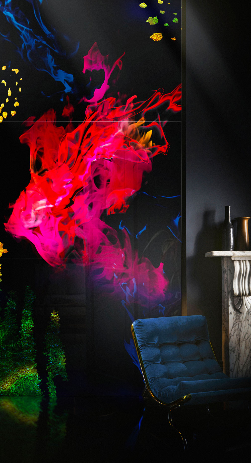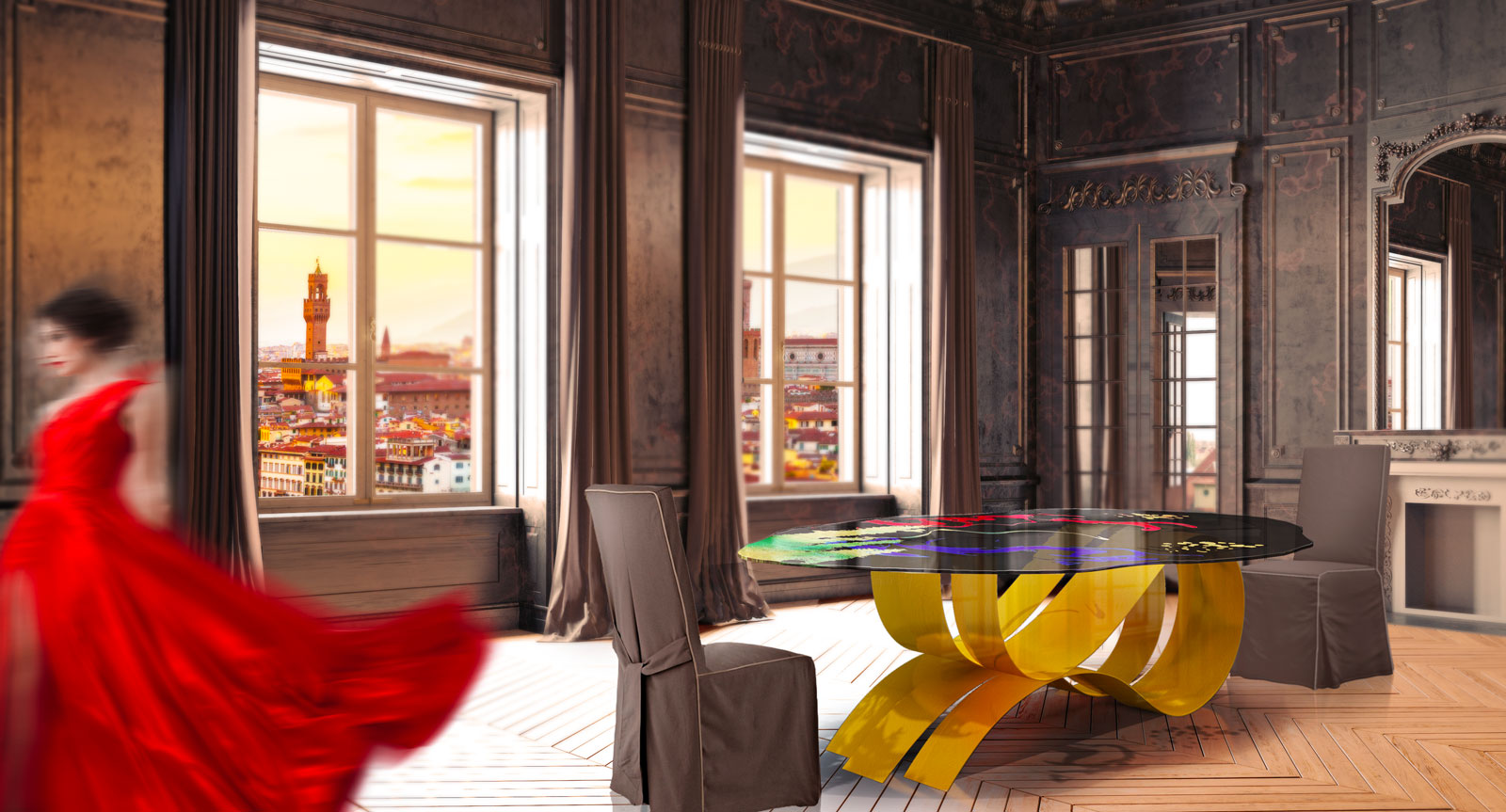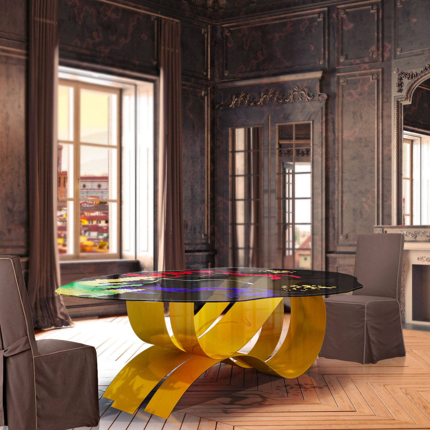 Table with extra-clear tempered, shaped glass top, thickness 12 mm., decorated with gold coloured leaf, sandblasting, digital printing, red, blue and semi-transparent black painting.
